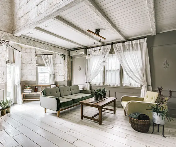 白やグレーなど淡い色を使ったシャービックなインテリアでナチュラルでフェミニンな雰囲気を演出します。吹き抜け空間とバランス良く配置された窓が開放感をもたらします。