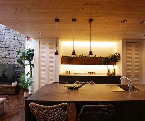 高級レストランのカウンター席のようなキッチンで、家族や友人と贅沢で特別なひと時を楽しむことができます。木目が美しい板張り天井は、空間のデザイン性を高め、カップボードのライトやペンダントライトが食卓を彩ります。