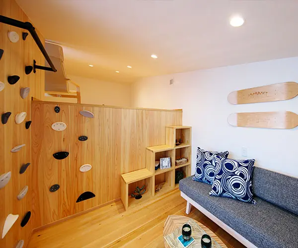 寝室からの階段を上がると、ご主人のためのこもれる書斎と体を鍛えるためのボルダリングや筋トレスペースを設けました。ロフトはご主人だけでなく、子供部屋などにもおすすめの間取りです。