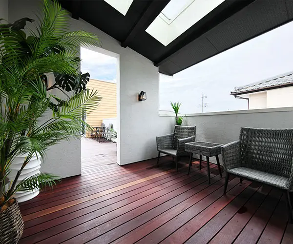 1階のLDKからは、水力が流れるテラスを見ながらくつろぐことができます。2階のバルコニーには、植物などを楽しんだり、夏場は、お子様のプールなどを楽しむスペースとしても利用できます。