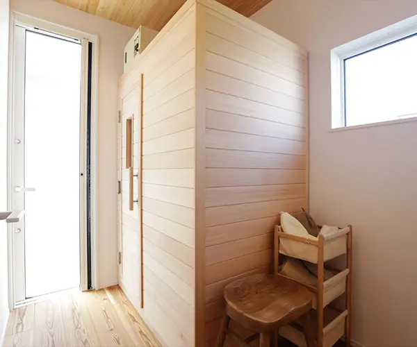 好きな時に好きなだけ利用できる憧れのプライベートサウナ。水が流れるテラスと繋がっているので、いつでも外気浴ができる贅沢な設備です。