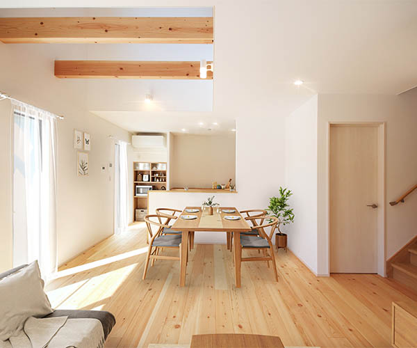 木の心地よさと美しさを堪能するダイニングは、キッチンから配膳しやすいレイアウトで、食事をスムーズに楽しむことができます。1階は吹き抜けが開放的なLDK。外と一体になる開放的なリビングダイニングと、食事しやすいカウンターキッチンでおうち時間を充実させます。