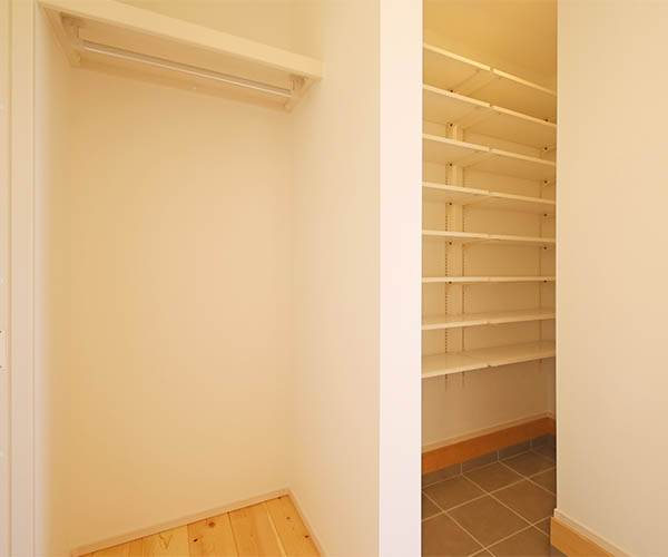オープンタイプのクローゼットは、家族みんなのアウターや靴が一目瞭然。出し入れもスムーズです。
