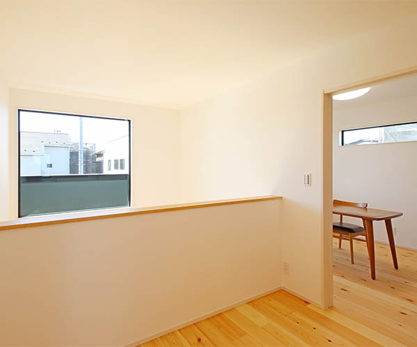 リビング上部は吹き抜けになっており、その吹き抜け2階部分には大きな窓が設けられ、リビングで寛ぐ家族には暖かな光が降り注ぎます。