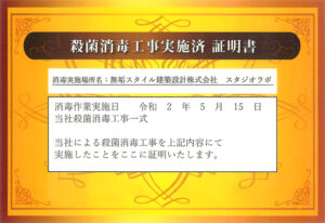 工事が完了すると、「殺菌消毒工事証明書」が発行されます。しっかりと殺菌消毒工事をしているという証明になりますので、安心につながっております。