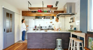築38年の一戸建。一人で住まわれていたお母様と、息子様ご家族が同居をするために2世帯住宅にリノベーション。梁を空間のアクセントにし、2階に新たにキッチン・洗面化粧台を設置。オープンウィンでリビングとバルコニーを繋ぎ、LDKが広く見えるよう、家具職人であるご主人とDIYを含めたプランを考案。広くなったバルコニーでは、バーベキューやグランピングが出来る憩いの場になりました。