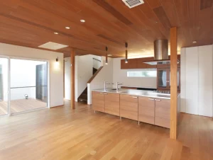 お施主様からの「外とつながる空間」の要望に、玄関ホール、リビング、和室、2階寝室などどこからでもつながる贅沢な中庭を提案しました。中庭はアウトドア好きのご家族のバーベキュースペース、サウナ後のくつろぎスペースとして活用しています。ファサードは道路から玄関までのアプローチに木製の壁とシンボルツリーを計画したことで、プライバシーや奥行き感、季節の流れを感じれるデザインとなりました。