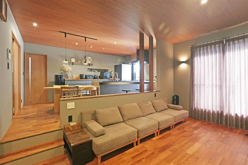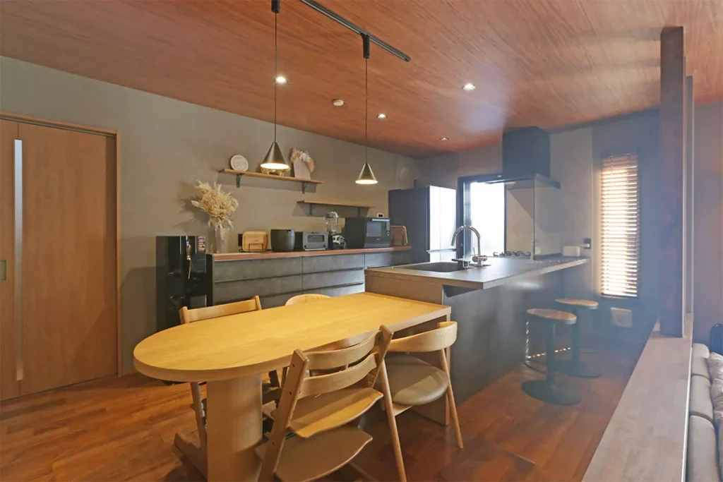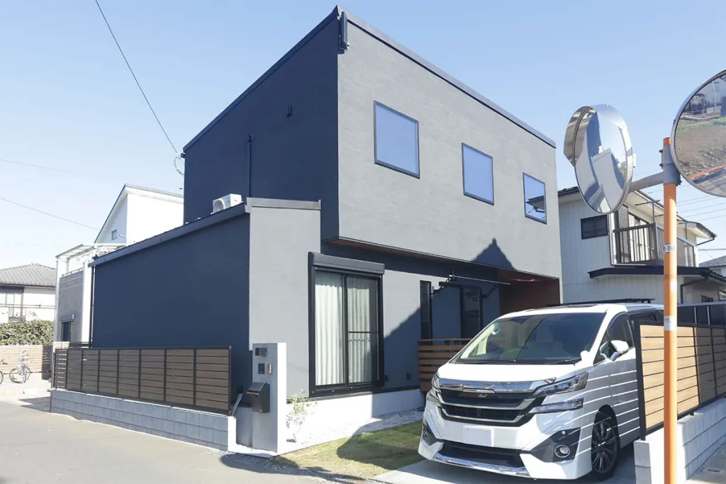 埼玉県さいたま市見沼区のM様邸は、グレーや黒を基調とした、クールな外観のお住まいです。リビングは閉鎖的で落ち着く空間を意識し、窓を小さくし、光の差し込みを抑えました。広々とした空間でご家族の時間を大切に過ごすことのできる、憩いの場に仕上がりました。