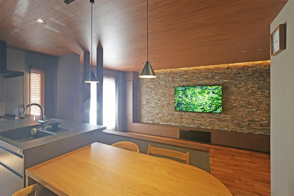 リビングの壁は、当初は最近流行りのエコカラットを見ていましたが、なんとなく綺麗に整列しすぎて味気ない感じがしていました。色々見ていくうちに外壁用の石壁がピンと来たので採用してみました。 -