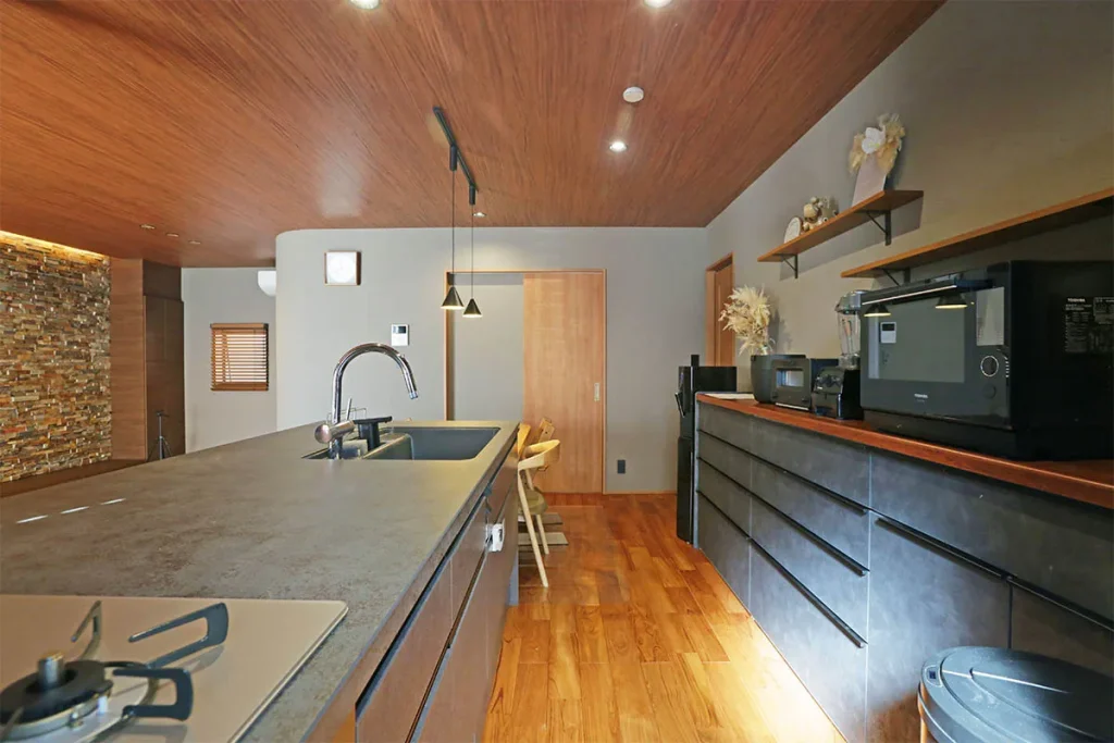 インドア派なので家の中でゆっくり過ごせる家を建てたかったです。開放的なイメージよりもやや閉鎖的で落ち着くイメージです。大きな窓は最小限にしたり、吹き抜けもやめました。あとは壁紙、天井、家具、家電を暗めの色で揃えました。リビングに外壁用の大きな石壁を設置して床も40センチ下げました。