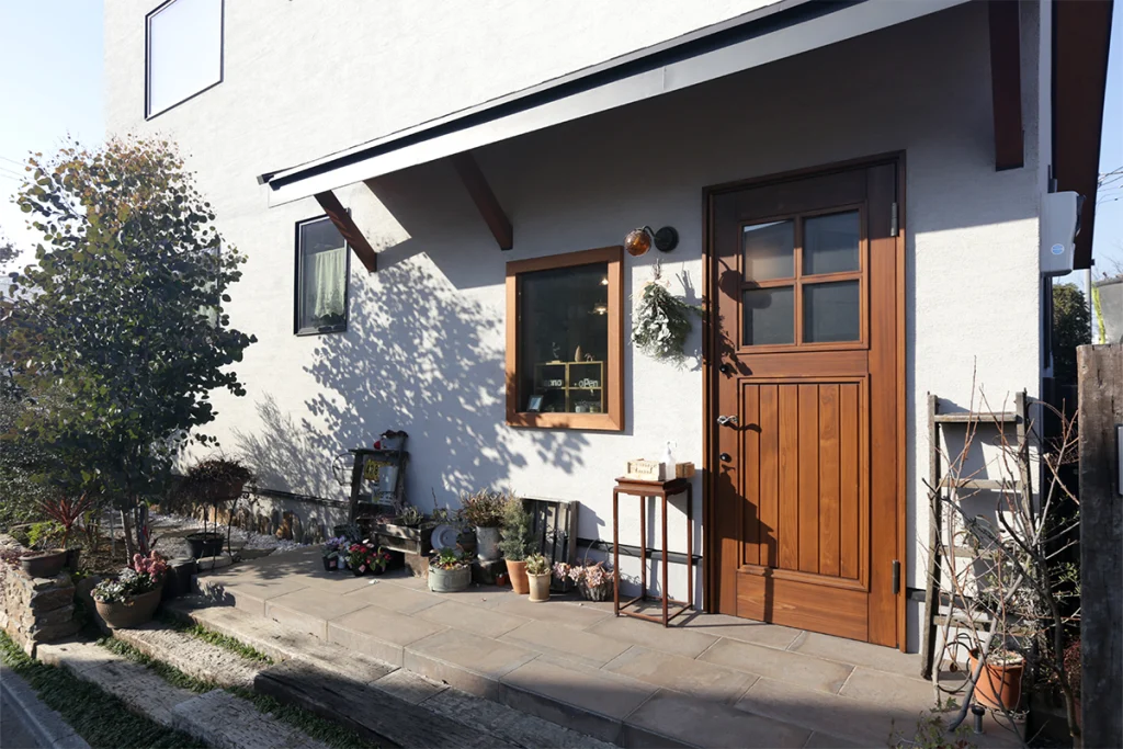 小さなハンドメイドのお店を作りたくて、玄関兼お店にしたので木製の玄関ドア、ドア横の木枠の窓はこだわりました。限られた敷地の中で生活しやすい動線や間取りを提案してくれました。 -