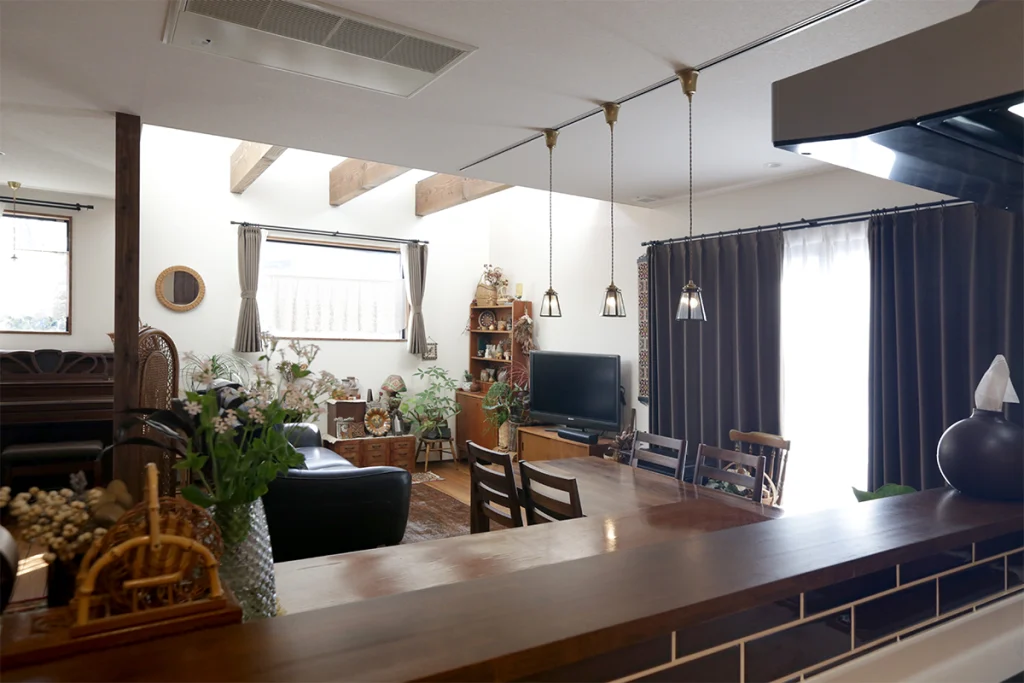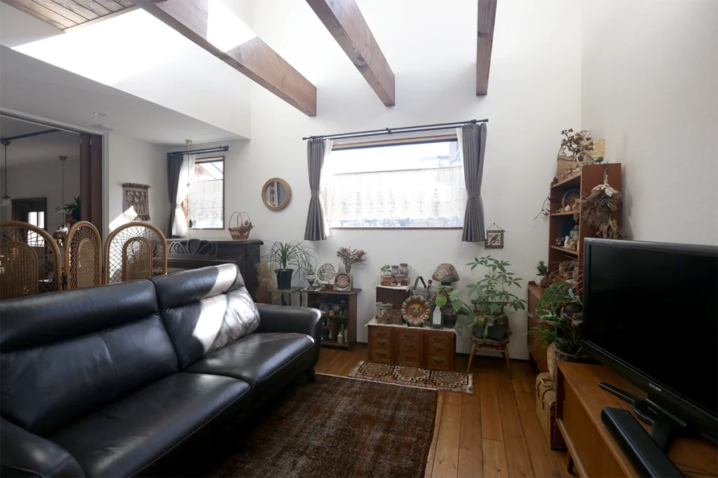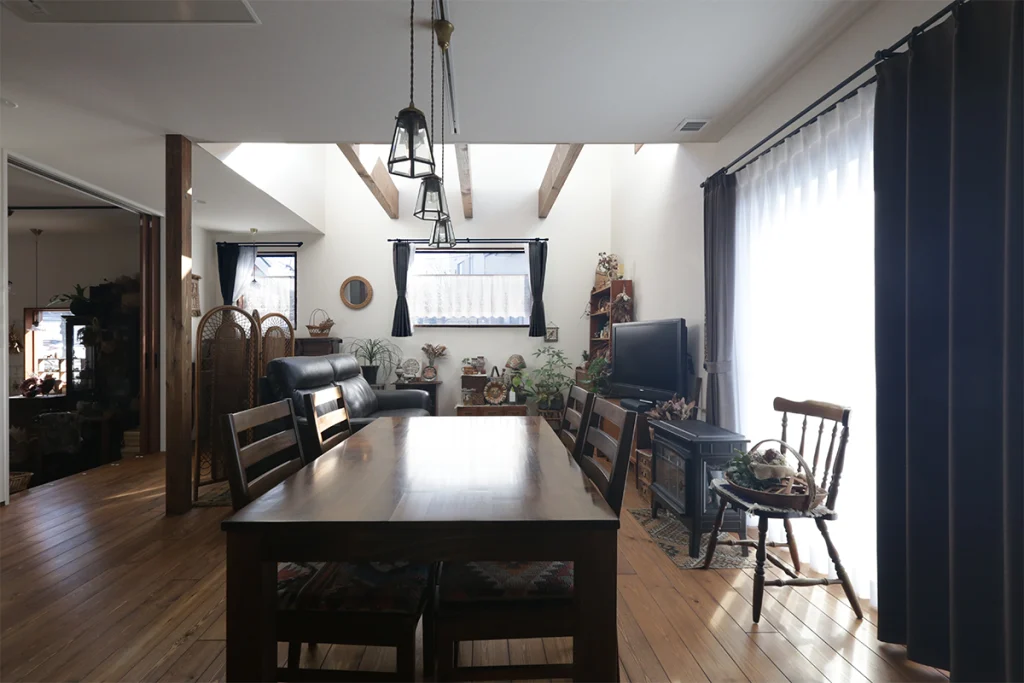 リビングで過ごすことがほとんどなのでリビングを落ち着く空間にしたかったのと、大好きなアンティークやヴィンテージ雑貨、観葉植物を飾りたいと思っていました。吹き抜けで梁をつけた明るいリビングは、大好きな雑貨や植物にに囲まれて大好きな空間になりました。