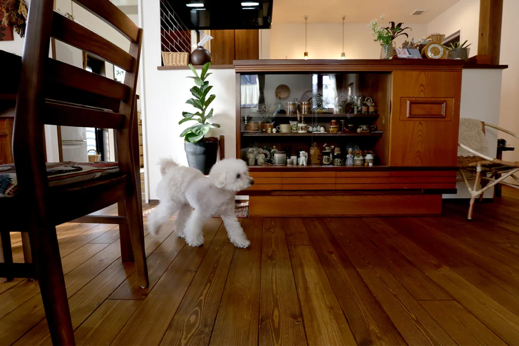 無垢の床は暖かく、夏は裸足で気持ち良く、冬もスリッパなしで過ごせます!柔らかいので、うたの足にも優しく滑らず安心です。