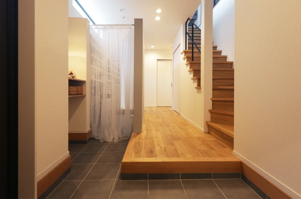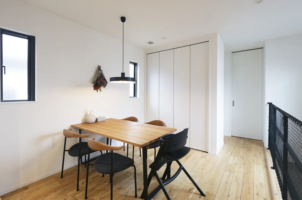 無垢材をふんだんに使った家は夏も冬も快適に暮らせます。スムーズな間取りで暮らしやすく、スタイリッシュなモノトーンと自然素材のあたたかさが調和するK様邸。ぜひ家づくりのご参考にしてください。