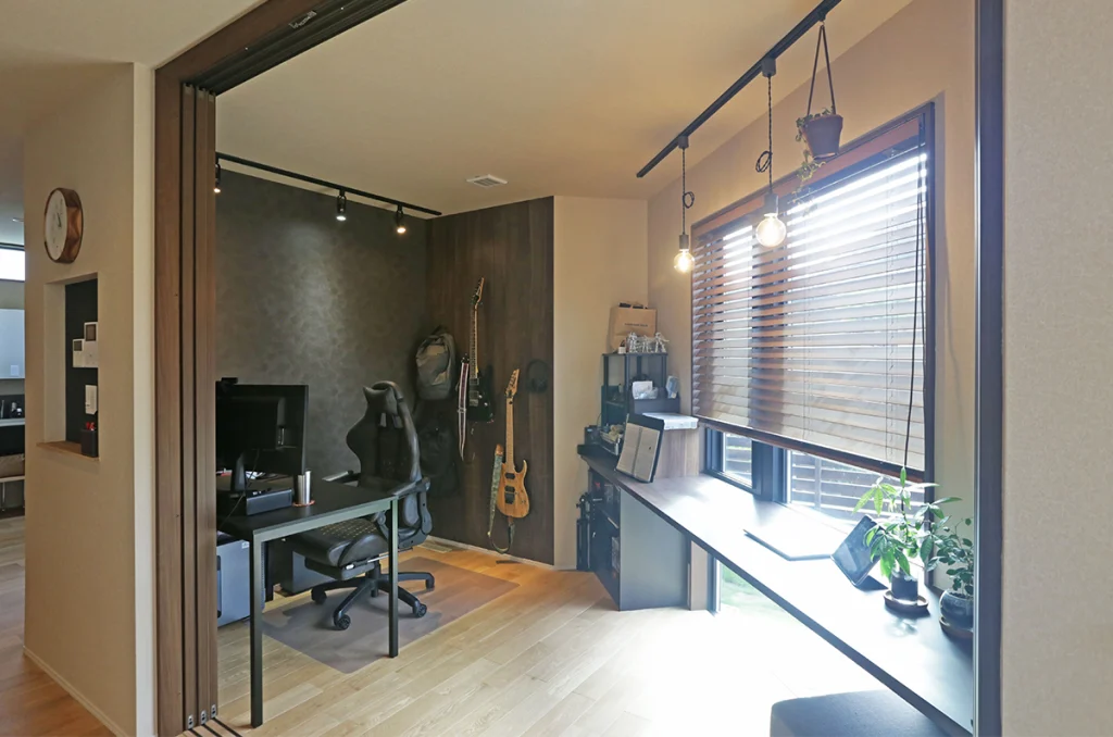 間取りを考えていた際、L字の家を考えていました。最初に、2階に書斎がある間取りを提案されましたが、仕事の合間に飲み物を取りに行ったり、利便性を考えてキッチンに近い1階に書斎が欲しくなり設計士の佐藤さんに相談したところ、L字の部分を斜めに切って窓外の景色も考えての間取りにしてくれました。三角形の書斎は、自分たちでは思いつかないアイディアだったので、とても驚きました。他の家にはない唯一無二の空間になり、とても気に入っております。