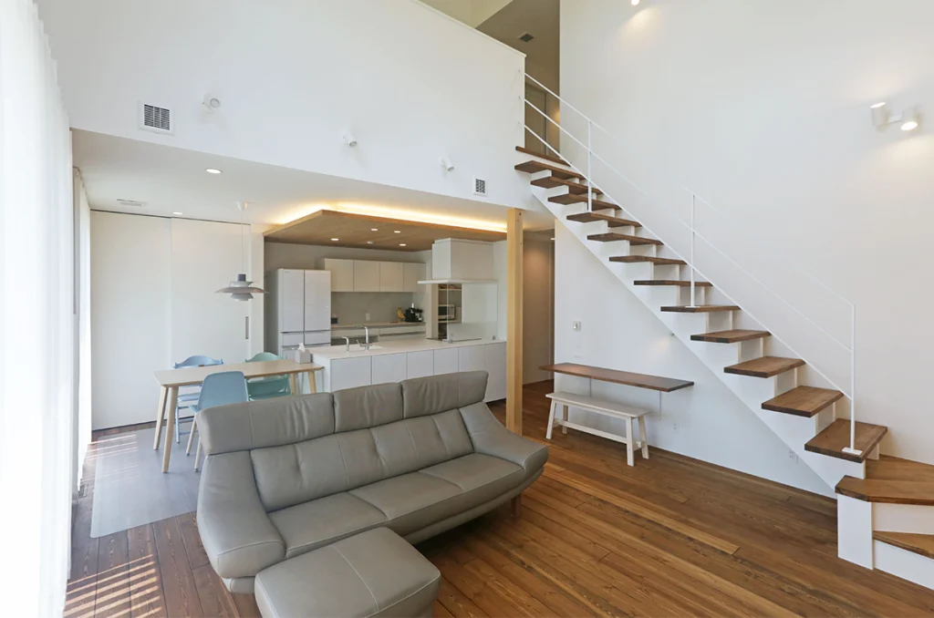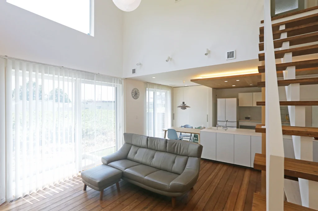 リビングの大きな吹き抜けと全館空調で家の中の温度が一定になり快適に過ごせています。キッチン周りを回遊動線の間取りにしたので、家事の効率がよくなりました。