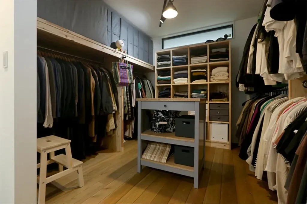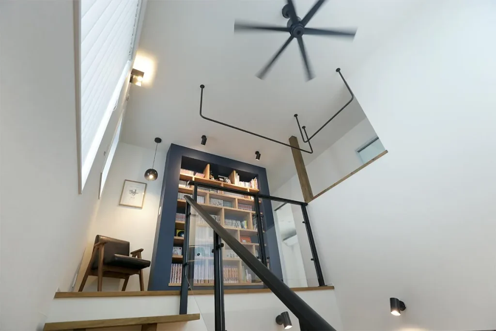 ネイビーの大きな本棚と、お店のように大きなウォークインクローゼットが主役の埼玉県川口市のF様邸。吹き抜けで干した洗濯物をそのままクローゼットにしまえる効率的な動線を実現するなど、共働きのお二人の家事が楽になるように追求した、こだわりが詰まった素敵なお住まいです。