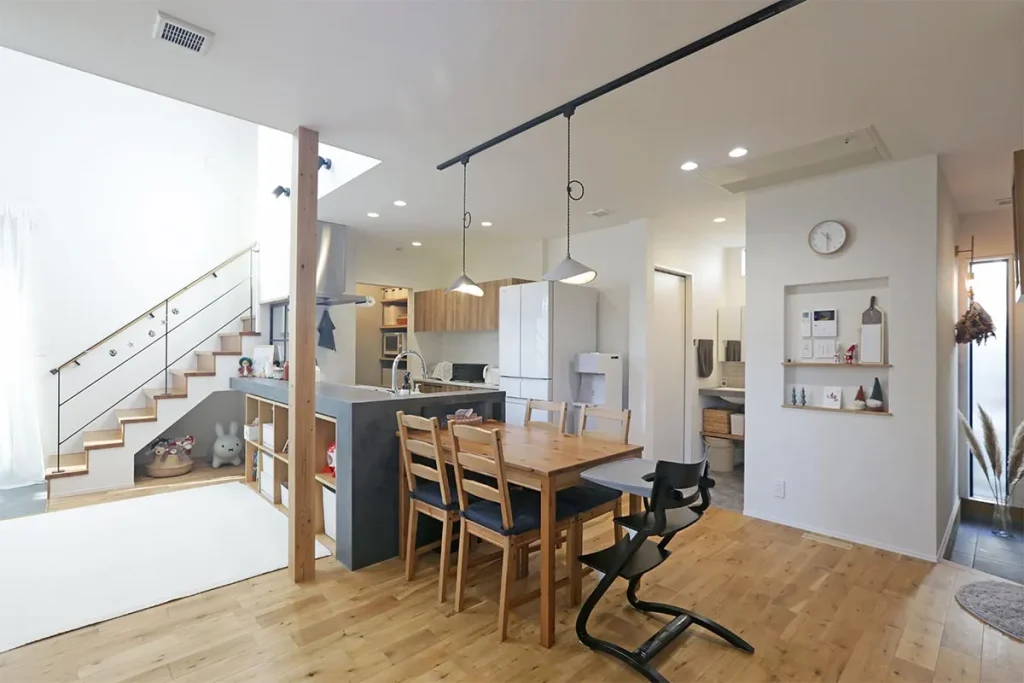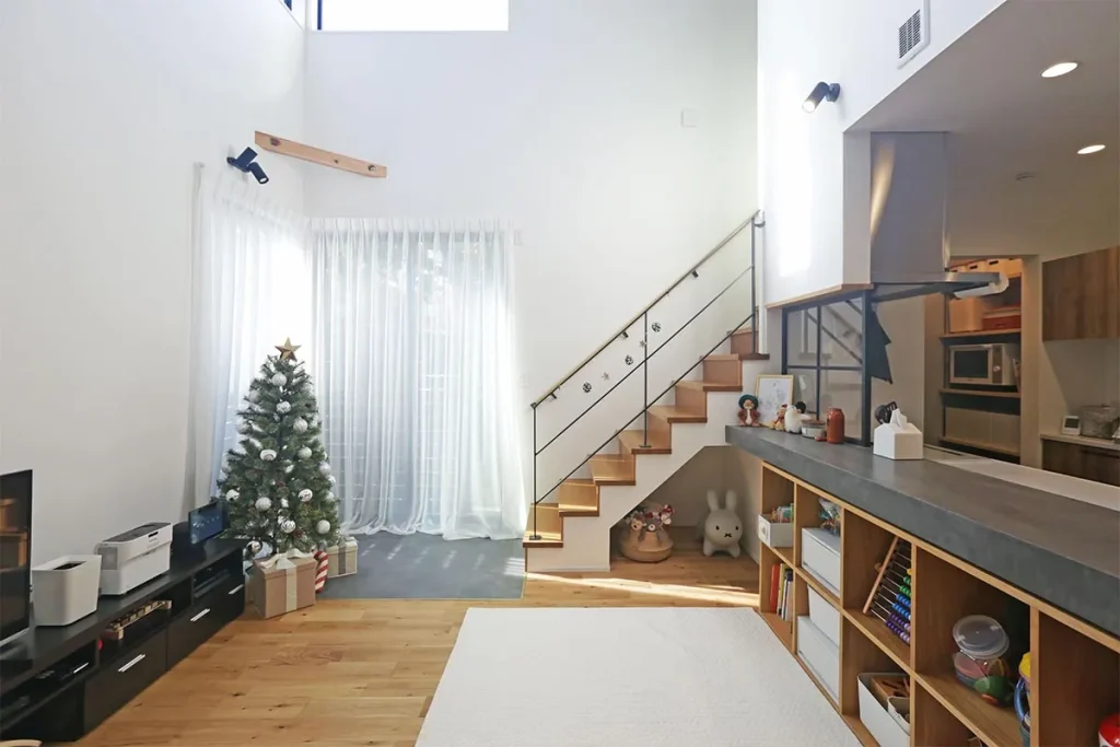 窓から空が見える吹き抜けリビングが開放的な、埼玉県さいたま市西区のK様邸。自然素材のぬくもりを感じる中で、憧れの鉄骨手すりの階段や、コンクリート調のキッチンカウンターが程よく空間を引き締めている、こだわりが詰まった素敵なお住まいです。